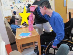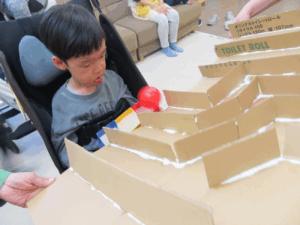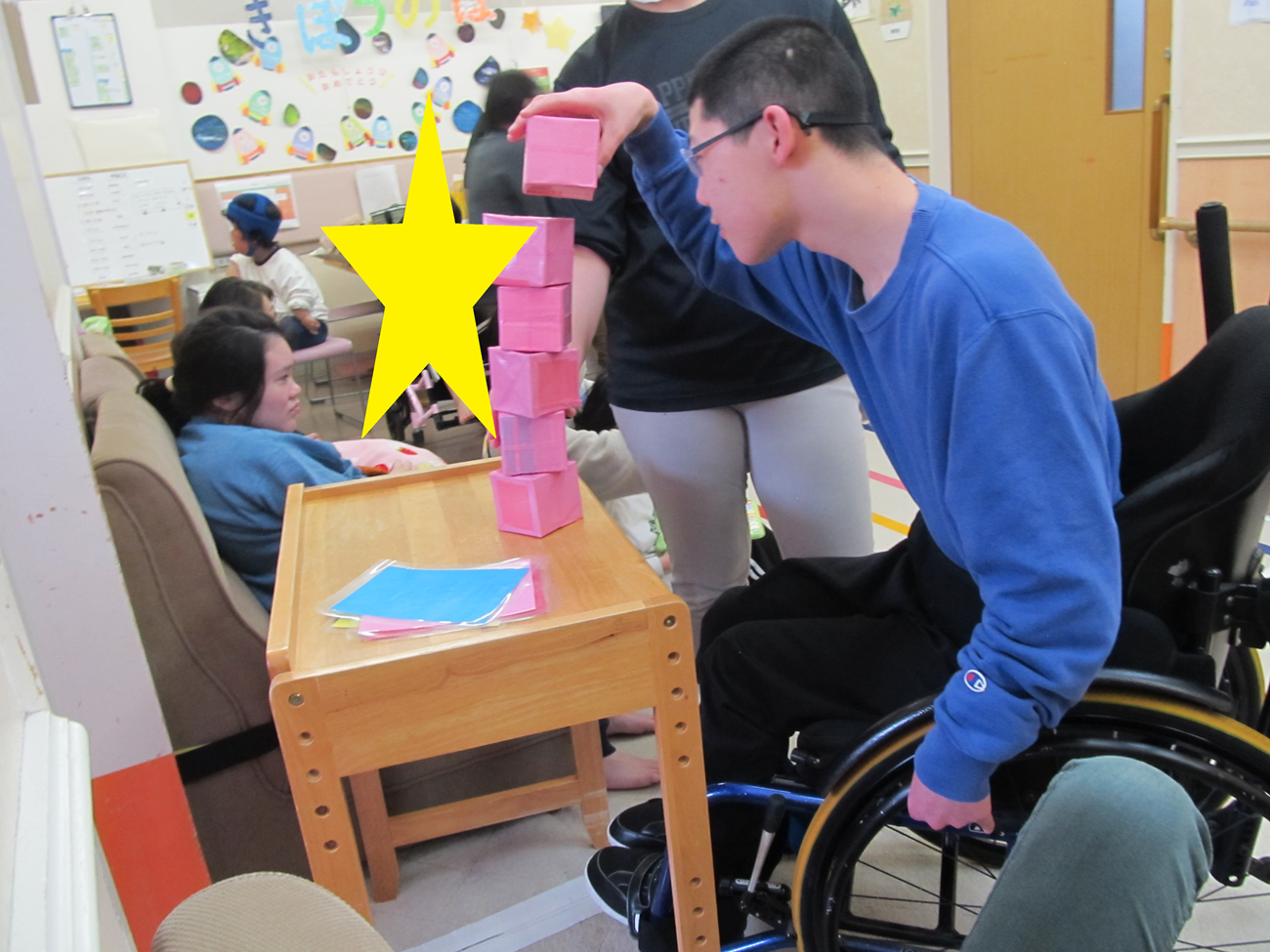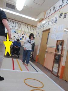 線の上を慎重に歩き、棒を的に当て、積み木を高く積み、身体を動かして楽しみました!友だちからの応援がうれしいですね(*’▽’)